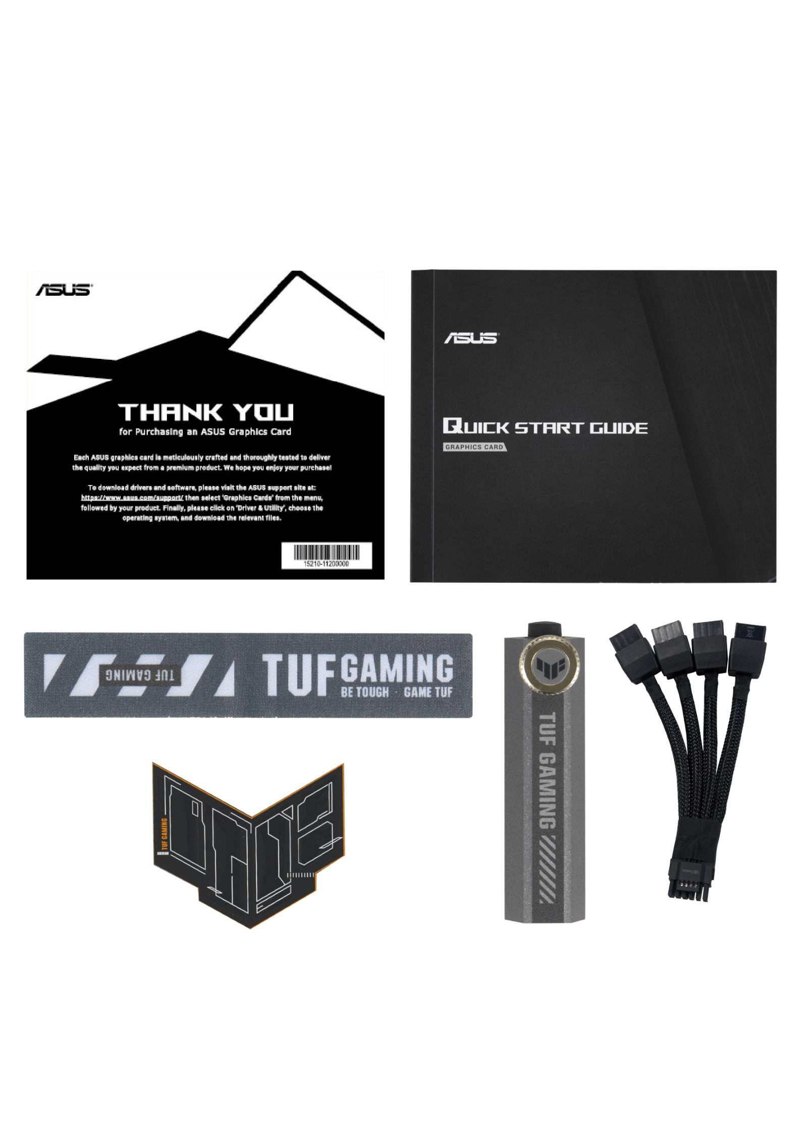 - Accessories: TUF card holder, Velcro strap, magnet, gaming certificate, key items, adapter cable, manuals, thank you card